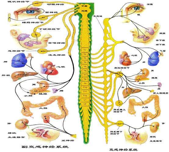 自主神經(jīng)包括交感神經(jīng)與副交感神經(jīng)兩個部分,其互相獨立又互相影響。它們與人體各部分器官的關(guān)系如下圖: