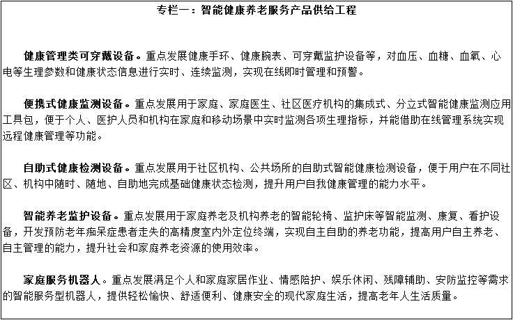 豐富智能健康養(yǎng)老服務產(chǎn)品供給。針對家庭、社區(qū)、機構(gòu)等不同應用環(huán)境,發(fā)展健康管理類可穿戴設(shè)備、便攜式健康監(jiān)測設(shè)備、自助式健康檢測設(shè)備、智能養(yǎng)老監(jiān)護設(shè)備、家庭服務機器人等,滿足多樣化、個性化健康養(yǎng)老需求。