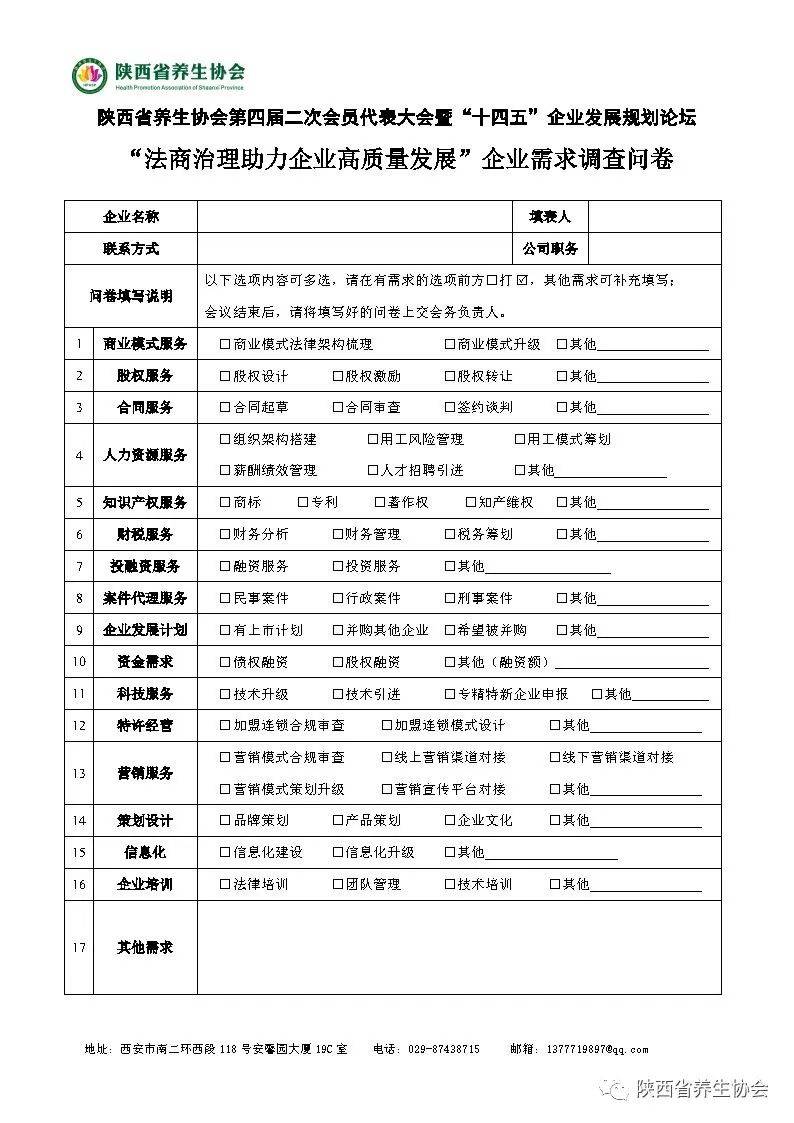 國(guó)家“十四五”規(guī)劃提出《法制民企行動(dòng)方案》,法商治理,打造健康的企業(yè),推進(jìn)企業(yè)治理體系和治理能力現(xiàn)代化,助力大健康產(chǎn)業(yè)企業(yè)高質(zhì)量發(fā)展,每個(gè)人需要健康,每個(gè)企業(yè)也需要健康的發(fā)展,協(xié)會(huì)發(fā)放的“法商治理助力企業(yè)高質(zhì)量發(fā)展”企業(yè)需求調(diào)查問(wèn)卷,能夠幫助協(xié)會(huì)更精準(zhǔn)的了解和服務(wù)會(huì)員單位。